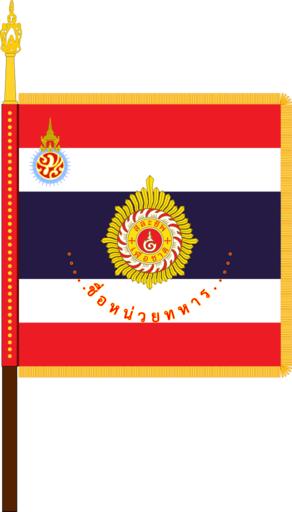 Keywords: ธงชัยเฉลิมพลหน่วยทหารบก (มีคันธง) (พ.ศ.2505-2522).svg en Royal Thai Army Unit Colours 1962-1979 The Flags of the Military Divisions B E 2505 1962 AD This is a tricolor flag with a crown in the top left-hand corner the identity of the King conveyed by the appropriate ordinal number in yellow Beneath the crown from which blue rays of light radiate are his Majesty's initials in red outlined in yellow The outer edges of the flag are trimmed in yellow braid 2 cms wide An announcement by the Ministry of Defense dated December 22 B E 2505 issued in line with the Royal Decree of B E 2479 1936 AD concerning flags specified the materials to be used to embroider the patterns on the flags of the various military units The military flag currently in use the ChaiChalermpol Flag follows the pattern specified in a special Royal Decree of B E 2522 1979 AD concerning flags http //www crwflags com/fotw/flags/th 5E html FOTW 2016-06-21 own Sodacan Inkscape PD-TH-exempt flags insignia other versions SVG flags - military of Thailand Unit colours of the Royal Thai Army Royal monograms of King Rama IX Flagpole finials |