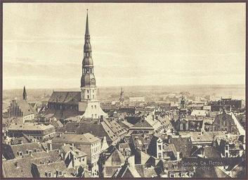 | Keywords: Собор Св. Петра на открытке.jpg Собо Св Пет а в соответствии с подписью в пано аме Риги Отк ытка конца XIX века Снимок сделан по всей видимости с башни Домского собо а http //foto inbox lv/alteriga/Cerkvi-Rigi/ конец XIX века author PD-Old-100 Saint Peter's Church Riga |