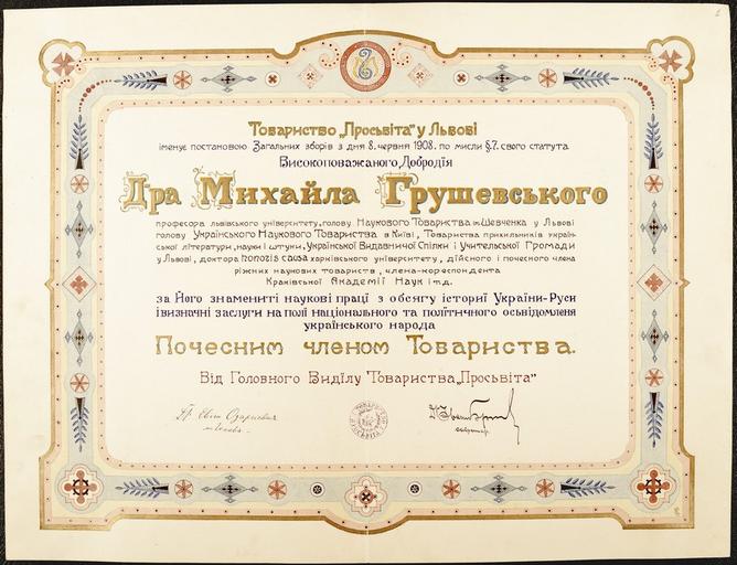 View Original:Грамота Товариства Просвіта у Львові про обрання М. С. Грушевського почесним членом Товариства.jpg (900x690)