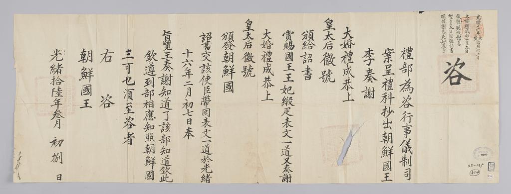 Keywords: 조선-청 외교문서(자문) 099.jpg 고종 27년 1890 3월 8 에 청국 예 에 조선국왕에게 보내 온 문 황 혼 후 황 후 존호 상과 련해 조선 왕비에게 비단 하사 것과 조 를 내린 것에 각 사 문에 해 알았다고 회답해 주는 내용 다 2016-07-18 http //www nl go kr/nl/search/SearchDetail nl category_code ct service KOLIS vdkvgwkey 1130241 colltype DAN_OLD place_code_info 172 place_name_info EB 94 94 EC A7 80 ED 84 B8 EC 97 B4 EB 9E 8C EC 8B A4 manage_code MA shape_code B refLoc null category srchFlag Y h_kwd E5 8F A4 E6 9C 9D51- EB 8B A428-139 lic_yn N mat_code RB 국립중앙도 조선국왕 청국예 other versions PD-Art Books from National Library of Korea Books from Korea 1890 in Relations of the Joseon Dynasty and the Qing Dynasty |