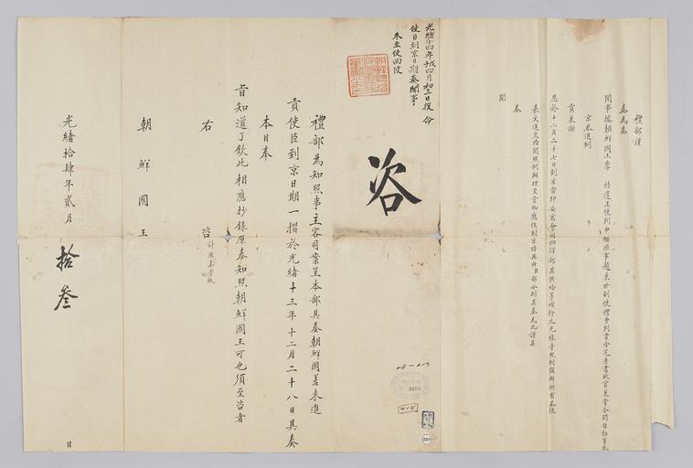 Keywords: 조선-청 외교문서(자문) 147.jpg 고종 25년 1888 2월 13 에 청국 예 에 조선국왕에게 보내 온 문 조선에 파견 연공 정사 조병세 등 행 12월 27 에 북경에 도착하 알리는 내용 다 2016-07-18 http //www nl go kr/nl/search/SearchDetail nl category_code ct service KOLIS vdkvgwkey 1130004 colltype DAN_OLD place_code_info 172 place_name_info EB 94 94 EC A7 80 ED 84 B8 EC 97 B4 EB 9E 8C EC 8B A4 manage_code MA shape_code B refLoc null category srchFlag Y h_kwd E5 8F A4 E6 9C 9D51- EB 8B A428-213 lic_yn N mat_code RB 국립중앙도 조선국왕 청국예 other versions PD-Art Books from National Library of Korea Books from Korea 1888 in Relations of the Joseon Dynasty and the Qing Dynasty |