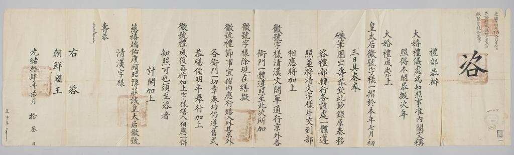 Keywords: 조선-청 외교문서(자문) 151.jpg 고종 25년 1888 7월 13 에 청국 예 에 조선국왕에게 보내 온 문 황상 皇上 혼 大婚禮 후에 황 후에게 존호를 올리는 자양 字樣 확 해 알려주는 내용 다 2016-07-18 http //www nl go kr/nl/search/SearchDetail nl category_code ct service KOLIS vdkvgwkey 1129991 colltype DAN_OLD place_code_info 172 place_name_info EB 94 94 EC A7 80 ED 84 B8 EC 97 B4 EB 9E 8C EC 8B A4 manage_code MA shape_code B refLoc null category srchFlag Y h_kwd E5 8F A4 E6 9C 9D51- EB 8B A428-218 lic_yn N mat_code RB 국립중앙도 조선국왕 청국예 other versions PD-Art Books from National Library of Korea Books from Korea 1888 in Relations of the Joseon Dynasty and the Qing Dynasty |