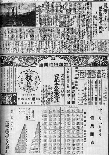 Keywords: 黒部鉄道開業報道記事.jpg ja 黒部鉄道三日市 - 下立間が開業した旨を報ずる新聞記事 1922 高岡新報 1922年(大正11年)11 11日 高岡新報社 other versions PD-Japan-organization PD-1923 Toyama Chiho Railway