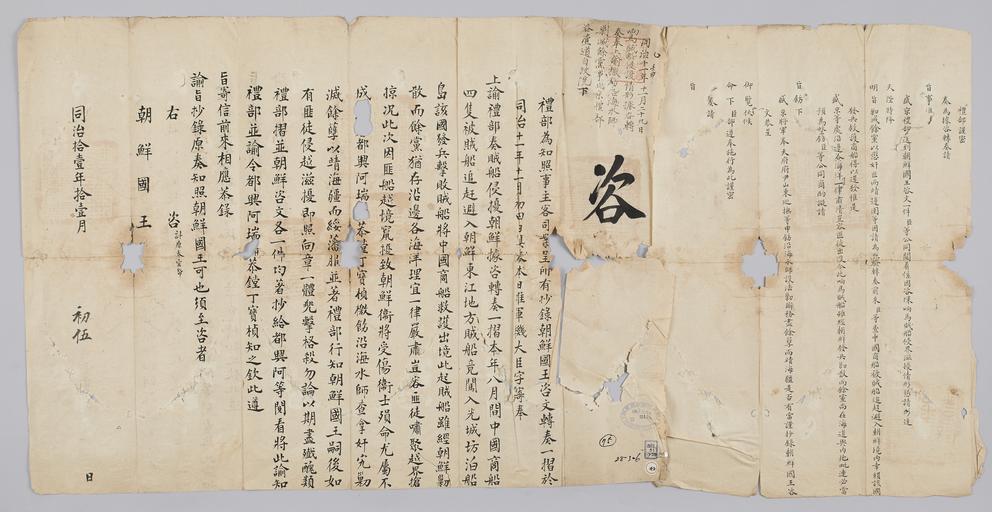 Keywords: 조선-청 외교문서(자문) 228.jpg 고종 9년 1872 11월 5 에 청국 예 에 조선국왕에게 보내 온 문 조선 경내에 비적선 匪賊船 에 쫓겨 온 중국 상선 4척 보호하고 비적 격파하느 고 조선 군사 사상 死傷 되었다는 조선국왕 보고에 하여 산동 무사 山 巡撫使 에게 명하여 해적들 소탕하도 명 내렸 알리는 문 다 2016-07-19 http //www nl go kr/nl/search/SearchDetail nl category_code ct service KOLIS vdkvgwkey 1130367 colltype DAN_OLD place_code_info 172 place_name_info EB 94 94 EC A7 80 ED 84 B8 EC 97 B4 EB 9E 8C EC 8B A4 manage_code MA shape_code B refLoc null category srchFlag Y h_kwd E5 8F A4 E6 9C 9D51- EB 8B A428-306 lic_yn N mat_code RB 국립중앙도 조선국왕 청국예 other versions PD-Art Books from National Library of Korea Books from Korea 1872 in Relations of the Joseon Dynasty and the Qing Dynasty |