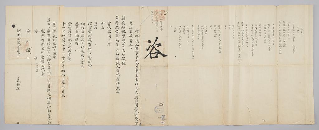 Keywords: 조선-청 외교문서(자문) 242.jpg 고종 10년 1873 6월 25 에 청국 예 에 조선국왕에게 보내 온 문 황상 정 親政 과 양궁 황 후 호 상 진하하러 온 경하사신 편에 보낸 조선국왕과 왕비에게 내린 상에 사 공물 정공 正貢 에 충당하 고 알리는 내용 다 2016-07-19 http //www nl go kr/nl/search/SearchDetail nl category_code ct service KOLIS vdkvgwkey 1130338 colltype DAN_OLD place_code_info 172 place_name_info EB 94 94 EC A7 80 ED 84 B8 EC 97 B4 EB 9E 8C EC 8B A4 manage_code MA shape_code B refLoc null category srchFlag Y h_kwd E5 8F A4 E6 9C 9D51- EB 8B A428-320 lic_yn N mat_code RB 국립중앙도 조선국왕 청국예 other versions PD-Art Books from National Library of Korea Books from Korea 1873 in Relations of the Joseon Dynasty and the Qing Dynasty |