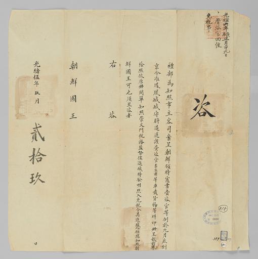Keywords: 조선-청 외교문서(자문) 271.jpg 고종 16년 1879 9월 29 에 청국 예 에 조선국왕에게 보내 온 문 조선에 파견 헌 재자 용숙 등 수레 싣고 온 재화에 해 면세 다고 알리는 내용 다 2016-07-19 http //www nl go kr/nl/search/SearchDetail nl category_code ct service KOLIS vdkvgwkey 1130089 colltype DAN_OLD place_code_info 172 place_name_info EB 94 94 EC A7 80 ED 84 B8 EC 97 B4 EB 9E 8C EC 8B A4 manage_code MA shape_code B refLoc null category srchFlag Y h_kwd E5 8F A4 E6 9C 9D51- EB 8B A428-349 lic_yn N mat_code RB 국립중앙도 조선국왕 청국예 other versions PD-Art Books from National Library of Korea Books from Korea 1879 in Relations of the Joseon Dynasty and the Qing Dynasty |