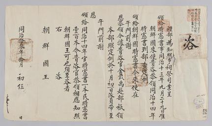 Keywords: 조선-청 외교문서(자문) 310.jpg 고종 11년 1874 10월 5 에 청국 예 에 조선국왕에게 보내 온 문 조선에 보낸 헌 재자 재우 金載禹 에게 헌 1 민 헌 100 를 하사하 다고 알리는 내용 다 2016-07-19 http //www nl go kr/nl/search/SearchDetail nl category_code ct service KOLIS vdkvgwkey 43367555 colltype DAN_OLD place_code_info 172 place_name_info EB 94 94 EC A7 80 ED 84 B8 EC 97 B4 EB 9E 8C EC 8B A4 manage_code MA shape_code B refLoc null category srchFlag Y h_kwd E5 8F A4 E6 9C 9D51- EB 8B A428-394 lic_yn N mat_code RB 국립중앙도 청국 예 급 other versions PD-Art Books from National Library of Korea Books from Korea 1874 in Relations of the Joseon Dynasty and the Qing Dynasty |
