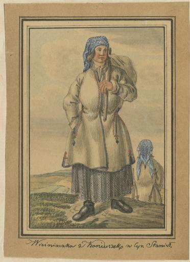 Keywords: Селянка з-під Конюшок 1836,.jpg uk Селянка з-під Конюшок ал з нату и Станісл ци куля Kobieta w niebieskiej chuście w białe groszki białym kaftanie i spódnicy z czarnym haftem na tle mijającej ją podobnie ubranej kobiety Wieśniaczka z Koniuszek w Cyr Stanisł 2016-04-21 http //www europeana eu/portal/record/2058635/_pau_oai_pauart_pl_BGR_RT_007_074 html Kielisiński Kajetan Wincenty other versions PD-old-70-1923 Ukrainian costume collection by Kajetan Kielisiński |