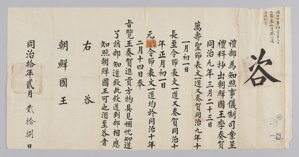 Keywords: 조선-청 외교문서(자문) 325.jpg 고종 8년 1871 2월 28 에 청국 예 에 조선국왕에게 보내 온 문 조선국왕 보낸 만수성절 문 萬壽聖 表文 장 령절 문 長至令 表文 원단령절 문 元旦令 表文 각 1도 道 를 황 에게 올렸 알리는 내용 다 2016-07-19 http //www nl go kr/nl/search/SearchDetail nl category_code ct service KOLIS vdkvgwkey 1130409 colltype DAN_OLD place_code_info 172 place_name_info EB 94 94 EC A7 80 ED 84 B8 EC 97 B4 EB 9E 8C EC 8B A4 manage_code MA shape_code B refLoc null category srchFlag Y h_kwd E5 8F A4 E6 9C 9D51- EB 8B A428-420 lic_yn N mat_code RB 국립중앙도 조선국왕 청국예 other versions PD-Art Books from National Library of Korea Books from Korea 1871 in Relations of the Joseon Dynasty and the Qing Dynasty |