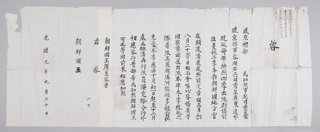 Keywords: 조선-청 외교문서(자문) 347.jpg 고종 20년 1883 9월 20 에 청국 예 에 조선국왕에게 보내 온 문 올해 10월 1 터 12월까 동계 통 에 만주 滿州 협령 協領尉 다 多祿 파견 다고 알리는 내용 다 2016-07-20 http //www nl go kr/nl/search/SearchDetail nl category_code ct service KOLIS vdkvgwkey 1130175 colltype DAN_OLD place_code_info 172 place_name_info EB 94 94 EC A7 80 ED 84 B8 EC 97 B4 EB 9E 8C EC 8B A4 manage_code MA shape_code B refLoc null category srchFlag Y h_kwd E5 8F A4 E6 9C 9D51- EB 8B A428-495 lic_yn N mat_code RB 국립중앙도 조선국왕 청국예 other versions PD-Art Books from National Library of Korea Books from Korea 1883 in Relations of the Joseon Dynasty and the Qing Dynasty |