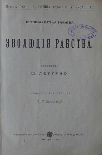 | Keywords: Летурно Ш. Эволюция рабства. (1897) — Тит. лист.jpg Из оглавления Рабство в животном ца стве ачала абства в еланезии Рабство в Аф ике Рабство у туземцев Аме ики в ексике и Пе у Рабство у азиатских на одов Рабство в Египте у семитов в Индии и Пе сии в Г еции в Риме у ев опейских ва ва ов и д http //www alib ru/5_leturno_sh_qvolyuciya_rabstva_w1t1640c871d4219e4e33ff4998001c4b17cd94 html Image page PD-RusEmpire Charles Letourneau Title pages of books from Russia Books from Russia 1897 Media of Russia to be categorised by city of publication Media of Russia to be categorised by subject Title pages uploaded by Steven Pavlov from various sources |
