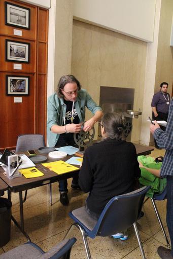 Keywords: Film inspection. Film owners discuss their films with K Sean before the film is taken into the theater to be screened. Home Movie Day 2015 in Raleigh, NC. Saturday, October 17, 2015, at the State Archives of North Carolina. Photo by Georgia Ponton. Film inspection. Film owners discuss their films with K Sean before the film is taken into the theater to be screened. Home Movie Day 2015 in Raleigh, NC. Saturday, October 17, 2015, at the State Archives of North Carolina. Photo by Georgia Ponton. |