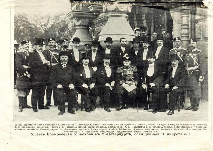 | Keywords: собор воскресения христова соборвоскресенияхристова 1907 спас-на-крови спаснакрови православный храм православныйхрам санкт-петербург санктпетербург храм архитектура екатерининский канал екатерининскийканал канал грибоедова каналгрибоедова church of the savior on blood churchofthesavioronblood orthodox church on spilt blood churchonspiltblood st-petersburg stpetersburg cathedral of the resurrection of christ cathedraloftheresurrectionofchrist church екатеринбургская императорская гранильная фабрика екатеринбургскаяимператорскаягранильнаяфабрика sport team sport Источник не нашёл. Взято: Группа строителей храма Воскресения Христова в С. Петербурге, присутствовавших на освящении его. Сидят, справа: г. Феделли, младший помощник архитектора; Н. К. Бодаревский, художник; граф И. Д. Татищев, ктитор храма; строитель храма, проф. А. А. Парланд; А. А. Орехов, помощник проф. Парланда; г. Никонов, казенный десятник. Стоят, справа: гг. Педашенко, представ. фирмы серебр. изделий Хлебникова; Фролов, мозаичник; Федоров, бронзов. дел мастер; Сапожников; Б. К. Ковальский; Фридлендер, представитель фирмы Шукерт и Ко. (добавил Nickolay) www.citywalls.ru/house2749.html Источник не нашёл. Взято: Группа строителей храма Воскресения Христова в С. Петербурге, присутствовавших на освящении его. Сидят, справа: г. Феделли, младший помощник архитектора; Н. К. Бодаревский, художник; граф И. Д. Татищев, ктитор храма; строитель храма, проф. А. А. Парланд; А. А. Орехов, помощник проф. Парланда; г. Никонов, казенный десятник. Стоят, справа: гг. Педашенко, представ. фирмы серебр. изделий Хлебникова; Фролов, мозаичник; Федоров, бронзов. дел мастер; Сапожников; Б. К. Ковальский; Фридлендер, представитель фирмы Шукерт и Ко. (добавил Nickolay) www.citywalls.ru/house2749.html |