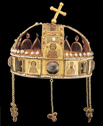 Keywords: Корона св. Стефана.jpg ru 13 Ко она св Стефана со вставками ихаил VII Дука цент его сына Константин слева и ко оль Венг ии Геза сп ава 1074-1077 Будапешт own Maxim91 century 11 Holy Crown of Hungary Greek letters Michael VII Doukas