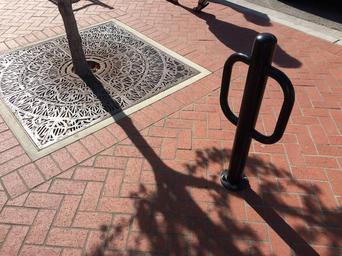 Keywords: bikerack bicyclestand bike bicycle bicycleinfrastructure postandring bollard treegrate drainage water quality streetfurniture bikeparking bicycleparking sidewalk solvang brick bricksidewalk