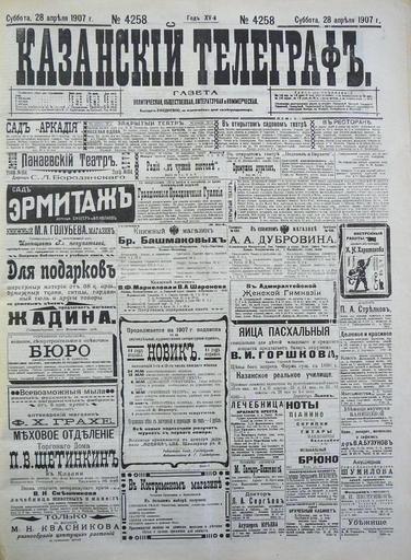 | Keywords: =Казанский Телеграф= (первая страница) от 28 апреля 1907 г..JPG Пе вая ст аница газеты Казанский Телег аф г Казань - 1907 - 4258 28 ап еля own Фото сделано 12 янва я 2011 г Алексеев Иго ь Евгеньевич Kazansky Telegraf Newspapers of Russia 1907 |