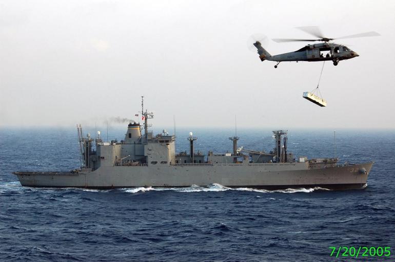 Keywords: 051129-N-6106R-079.Pacific Ocean (Nov. 29, 2005) – An MH-60S Seahawk helicopter transports supplies from the Military Sealift Command (MSC) ammunition ship USNS Flint (T-AE 32) to the conventionally powered aircraft carrier USS Kitty Hawk (CV 63) during a vertical replenishment. Kitty Hawk and embarked Carrier Air Wing Five (CVW-5) are currently conducting operations in the Western Pacific Ocean. U.S. Navy photo by Photographer's Mate Airman Stephen W. Rowe (RELEASED).. |