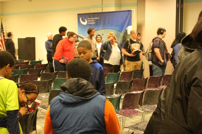 Keywords: Award-winning author Jason Reynolds returned to Kalamazoo on Wednesday, April 13, 2016, for a Meet the Author event at Central Library. Jason recently received the prestigious Walter Dean Myers Award for Outstanding Children’s Literature, and the American Library Association’s 2016 Coretta Scott King Honor Award for outstanding African American authors. Photo by Farrell Howe. www.kpl.gov Award-winning author Jason Reynolds returned to Kalamazoo on Wednesday, April 13, 2016, for a Meet the Author event at Central Library. Jason recently received the prestigious Walter Dean Myers Award for Outstanding Children’s Literature, and the American Library Association’s 2016 Coretta Scott King Honor Award for outstanding African American authors. Photo by Farrell Howe. www.kpl.gov