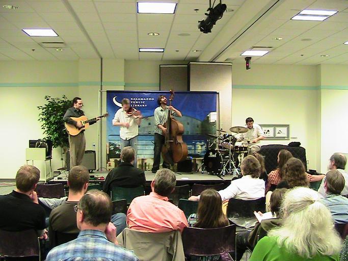 Keywords: kalamazoo library live concert liveconcert folk bluegrass jazz celtic indie indoor room State champion bluegrass fiddler Brad Phillips, national award-winning jazz percussionist Mike Shimmin, national champion soloist jazz bassist Andrew Kratzat, and title-defying-creative-mastermind-insert­-adjective-here guitarist Jesse Lee Mason share an active interest in jazz. Millish performed at Kalamazoo Public Library on May 13, 2009, as part of the library's Live Music @ KPL series. www.kpl.gov/music/ State champion bluegrass fiddler Brad Phillips, national award-winning jazz percussionist Mike Shimmin, national champion soloist jazz bassist Andrew Kratzat, and title-defying-creative-mastermind-insert­-adjective-here guitarist Jesse Lee Mason share an active interest in jazz. Millish performed at Kalamazoo Public Library on May 13, 2009, as part of the library's Live Music @ KPL series. www.kpl.gov/music/