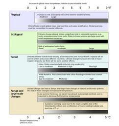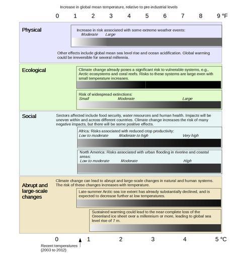 Keywords: Impacts of global warming 2.png Talk Effects of global warming Impacts are organized into 4 categories 1 Physical systems 2 ecological systems 3 social systems; and 4 abrupt and large-scale changes The shaded bars indicate the level of risk associated with different magnitudes of global warming The following scale is used White shading no detectable risk Light grey small risk Medium grey moderate risk Dark grey large risk Black severe risk Risks apply to observed and projected climate change Later text explains whether observed risks are attributable to climate change or due to climate variability Some risks are given based on 1 current adaptation c a practices to climate variability and change and 2 for a hypothesized highly adapted state h a Global temperatures are measured relative to pre-industrial times approximated as the years 1850 to 1900 Recent times are taken as 2003 to 2012 Physical systems Increase in risk associated with some extreme weather events small to moderate risk at present; large risk starting around 1 6 °C Other effects of global warming include global mean sea level rise and ocean acidification Global warming could be irreversible for several millennia Ecological systems Climate change is a significant risk for some ecosystems and organisms e g Arctic ecosystems and coral reefs Moderate risk at present; large risk from 1 6 °C; severe risk from 2 6 °C Risk of widespread extinctions Small at present; moderate at 2 °C; large at 4 °C Social systems Sectors affected include food security water resources and human health Impacts will be uneven within and across different countries Climate change increases the risk of many negative impacts but there will be some positive effects Africa Risks associated with reduced crop productivity Present Moderate c a or low h a risk from climate variability; 2 °C high c a or moderate h a ; 4 °C very high c a and h a North America Risks associated with urban flooding in riverine and coastal areas Present Moderate c a or low h a risk from climate variability; 2 °C moderate c a and h a ; 4 °C high c a and h a Abrupt and large-scale changes Climate change can lead to abrupt and large-scale changes in natural and human systems The risk of these changes increases with temperature Declines in late-summer Arctic sea ice extent Present low to moderate risk; 2 °C moderate to large risk; 4 °C severe risk Sustained global warming could lead to the near-complete loss of the Greenland ice sheet over a millennium or more which would result in global mean sea level rise of about 7 m risk is low at 1 to 2 °C; moderate at 3 °C and large at 4 °C and above Notes Sources are Working Group's I and II WG1 and 2 contributions to the Intergovernmental Panel on Climate Change 5th Assessment Report IPCC AR5 2013 and 2014 ; and the US National Research Council US NRC 2013 report Abrupt Impacts of Climate Change Anticipating Surprises Details IPCC AR5 WG1 references http //www ipcc ch/report/ar5/wg1/ https //web archive org/web/20140922183922/http //www ipcc ch/report/ar5/wg1/ archive url Summary for Policymakers IPCC AR5 WG2 references http //www ipcc ch/report/ar5/wg2/ https //web archive org/web/20140930030331/http //ipcc ch/report/ar5/wg2/ archive url Summary for Policymakers; Technical Summary; Chapter 19 US NRC http //www nap edu/openbook php record_id 18373 https //web archive org/web/20140701105615/http //www nap edu/openbook php record_id 18373 archive url 2014-10-07 07 13 56 own Enescot other versions File Impacts of global warming 2 svg svg cc-zero Uploaded with UploadWizard Global warming |