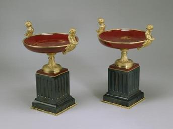 | Keywords: Imperial Glassworks - Pair of Tazzas - Walters 47415, 47416 - Group.jpg These kylix-shaped bowls are mounted with gilded bronze handles in the form of putti and are borne on feet decorated with acanthus leaves of the same metal Gilded bronze beading has also been applied to the fluted bases of the gray-blue glass The most outstanding feature of these tazzas is the intense sang de boeuf red of the bowls The material is purpurine a dense lead-potash glass containing crystals of cuprous oxide in a clear matrix It is named after porporino a red glass that had been developed by Alessio Matteoli in the Vatican mosaic workshop during the 18th century Leopold Bonafede one of two Italian brothers called to Russia in the mid 1850s by Tsar Nicholas I produced purpurine at the Imperial Glassworks in St Petersburg The earliest documented use of this product was for five of the Imperial Glassworks' six entries at the Paris Exposition Universelle in 1867 After Bonafede's death in 1878 purpurine continued to be made at the factory under the direction of the chief chemist S P Petuchov The Imperial Glassworks supplied Fabergé with purpurine though the jewelry firm developed its own purpurine of a slightly different chemical composition after 1880 late Other date century 19 purpurine gilded bronze colored glass cm 24 13 accession number 47 415 47 416 77444 Alexandre Polovtsoff Aleksandr Aleksandrovich Polovtsov Paris Henry Walters city Baltimore Walters Art Museum Henry Walters Acquired by Henry Walters 1930 place of origin St Petersburg Russia PD-old-auto 1917 Imperial Glassworks Glassware in the Walters Art Museum |