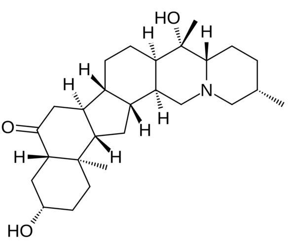 Keywords: Imperialine.svg Chemical structure of imperialine imperialin peiminine sipeimine jashmirine 3-beta 5-alpha 17-beta -3 20-dihydroxycevan-6-one Own 19 40 18 March 2014 UTC Ed Edgar181 Alkaloids