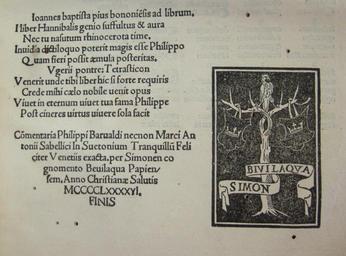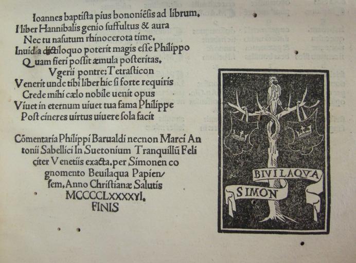 Keywords: text writing Ioannes baptista pius bononiensis ad librum. I liber Hannibalis genio suffultus & aura / Nec tu nasutum rhunocerota time. / Inuidia dictiloquo poterit magis esse Philippo / Quam fieri possit aemula posteritas. / Ugerii pontre : Tetrasticon / Venerit unde tibi liber his si forte requiris / Crede mihi caelo nobile venit opus / Vivet in eternum vivet tua fama Philippe / Post cineres virtus vivere sola facit Commentaria Philippi Barualdi necnon Marci Antonii Sabellici In Suetonium Tranquillum Feliciter Venetiis exacta. Per Simonen cognomento Bevilaqua Papiensen. Anno Christianae Salutis MCCCCLXXXXVI Finis Ioannes baptista pius bononiensis ad librum. I liber Hannibalis genio suffultus & aura / Nec tu nasutum rhunocerota time. / Inuidia dictiloquo poterit magis esse Philippo / Quam fieri possit aemula posteritas. / Ugerii pontre : Tetrasticon / Venerit unde tibi liber his si forte requiris / Crede mihi caelo nobile venit opus / Vivet in eternum vivet tua fama Philippe / Post cineres virtus vivere sola facit Commentaria Philippi Barualdi necnon Marci Antonii Sabellici In Suetonium Tranquillum Feliciter Venetiis exacta. Per Simonen cognomento Bevilaqua Papiensen. Anno Christianae Salutis MCCCCLXXXXVI Finis |