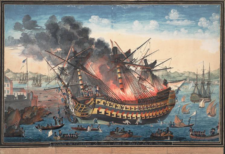 | Keywords: Incendie du vaisseau le Mara 1798.jpeg en One of a pair of slightly crude but carefully detailed original watercolors by de Gueydon; this one showing conflagration on warship near fort in harbor and escaping personnel officers sailors and marines small figures of colonial infantry near fort fr Aquarelle montrant le navire de guerre Le Mara prenant feu dans Port-Louis Ile-de-France avec la fuite de son équipage 1798 http //library brown edu/cds/catalog/catalog php verb render id 1267497836859375 Brown edu Henri de Gueydon PD-old-100 Uploaded with UploadWizard History of the French Navy Port Louis harbour Historical images of Port Louis Ships of the line of France |