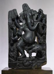 Keywords: Indian - Ganesha - Walters 2549.jpg Ganesha a son of the supreme god Shiva is the Hindu god worshiped at the start of an endeavor According to Hindu mythology the universe is periodically destroyed when Shiva dances His son Ganesha is a dancer too and like his father he holds a drum At the same time Ganesha with his potbelly and his desire for sweets has a character different from Shiva's Ganesha was originally created by his mother Parvati while his father was absent; when Shiva returned he decapitated Ganesha After Parvati demanded that Shiva replace the child's head servants came back with the head of an elephant 1st half Other date century 11 muscovite biotite schist cm 96 8 58 5 accession number 25 49 6009 J Gilman d'Arcy Paul Baltimore date and mode of acquisition unknown Walters Art Museum Gift of J Gilman d'Arcy Paul 1967 place of origin Bihar India Walters Art Museum license Hindu art in the Walters Art Museum Media contributed by the Walters Art Museum needs category review Dancing Ganesha in sculpture 11th-century art of India Sculptures from Bihar |
