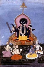 | Keywords: Indian - Kali as the Supreme Deity - Walters W897.jpg The terrifying goddess Kali wearing a necklace of skulls and holding a severed head in one of her hands is here worshiped by the great gods From the left we see Indra Brahma the creator Vishnu the preserver and Shiva the destroyer Kali stands for the forces of destruction but she is also a life-giver Her posture is that of a woman giving birth ca 1800 pigments paper cm 27 62 17 46 accession number W 897 885 John and Berthe Ford Baltimore date and mode of acquisition unknown Walters Art Museum John Berthe Ford 2002 place of origin Chamba India Walters Art Museum license 2D Hindu art in the Walters Art Museum Paintings of Kali Paintings of Shiva Indra Paintings of Brahma Paintings of Vishnu 1800s paintings from India 19th-century watercolor paintings from India Paintings of India in the Walters Art Museum Chamba State |