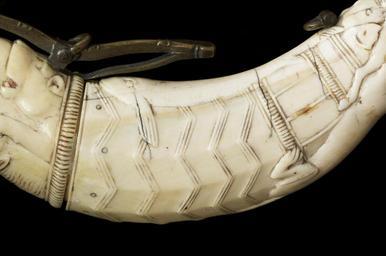 | Keywords: Indian - Powder Flask - Walters 71419 - Detail C.jpg The powder flask also known as a priming flask was an essential firearm accessory and held the fine powder needed to make the gun fire Gunmakers in India during the Mughal era 1526-1858 specialized in carving ivory powder flasks with animal figures Often as these two examples the decoration consists of intertwined and composite creatures that seem to grow out of or attack one another One such menagerie on the right-hand flask includes a cheetah or lion chasing an antelope in the center and bucks antelopes lions birds a boar elephant and mongoose at the two ends Many of these animals were regularly hunted or used for hunts as with the elephant in Mughal India century 18 Early Modern ivory set with amber steel cm 6 2 16 2 2 5 accession number 71 419 40388 Max and Maurice Rosenheim date and mode of acquisition unknown Sale Sotheby's London May 9-11 1923 lot 304 Henry Walters Baltimore 1923 mode of acquisition unknown Walters Art Museum Henry Walters Acquired by Henry Walters 1923 place of origin India Walters Art Museum license Weapons in the Walters Art Museum Indian gunpowder flasks 18th-century ivory Mughal art in the Walters Art Museum Media contributed by the Walters Art Museum needs category review |