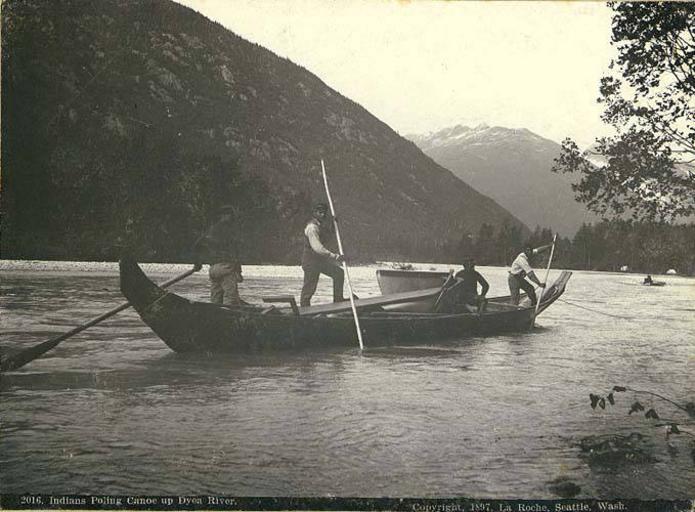 Keywords: Indians poling canoe up Dyea River, Alaska, 1897 (LAROCHE 306).jpeg Photograph Creator Frank La Roche Caption on image Indians poling canoe up Dyea River c1897 Indians poling canoe up Dyea River These are w Metlakatla Alaska Metlakahtla Indians from the mission schools that are four hundred miles below They have in transit a knock-down boat the bow of which is a conspicuous feature They receive two hundred dollars for taking two such boats from the head of canoe navigation to the summit of Chilkoot Pass about ten miles Canoes can be readily obtained from the Indians but it is not advisable to attempt to use them without the assistance of Indians who are familiar with the frail birch-bark vessels Like many other things they are easily maneuvered when properly understood These canoes can be secured to carry considerable weights Frank La roche En Route to the Klondike 1898 Subjects LCTGM Canoes--Alaska; Rivers--Alaska Subjects LCSH Indians of North America--Alaska; Dyea River Alaska depicted place Alaska 1897 Institution University of Washington UWASH-LAROCHE-source accession number laroche 306 PD-old-auto-1923 1936 Information field Order Number LAR188 Poling boats Canoes in the United States Taiya River 1897 in Alaska Black and white photographs |