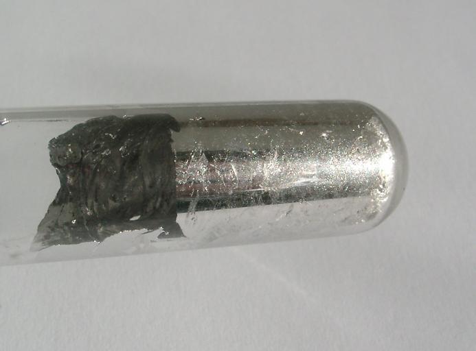 Keywords: Indium wetting glass.jpg en Indium wetting the glass surface of a test tube Own Schtone 2008-11-12 Indium