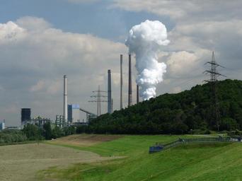 Keywords: industry factory metallurgical plant ruhr area duisburg industrial plant chimney fireplace power line smoke pollution exhaust gases dike meadow niederrhein river landscape