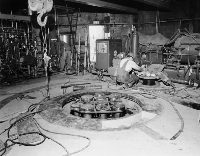 Keywords: INEEL 58-1360 HAER ID-33-D-64 195650pu.jpg en ARA-II Army Reactors Area 2 Interior view of SL-1 reactor building with reactor head in place in center foreground March 21 1958 INEEL photo no 58-1360 Photographer Jack L Anderson - Idaho National Engineering Laboratory Army Reactors Experimental Area Scoville Butte County ID Reproduction Number HAER ID-33-D-64 1958-03-21 http //www loc gov/pictures/item/id0410 photos 195650p/ Jack L Anderson - Idaho National Engineering Laboratory Army Reactors Experimental Area Scoville Butte County ID other versions 43 518233 -112 8237 Original 4x5 print with Library of Congress Prints and Photographs Division Washington D C 20540 USA http //hdl loc gov/loc pnp/pp print PD-USGov Uploaded with UploadWizard SL-1 Reactor Idaho National Laboratory ImageNote 1 2118 2747 42 42 4063 3158 2 Operating floor Note that none of the shield blocks are shown but they would sit atop the reactor during operation and be removed for maintenance ImageNoteEnd 1 ImageNote 2 2039 2051 42 42 4063 3158 2 Central Control Rod Rod Number 9 would be inserted here and is the most reactive in the core This rod had no reported sticking for the 6 months prior to the accident No control Rod Drive Motors are shown in this picture because the plant is still under construction ImageNoteEnd 2 ImageNote 3 1939 638 42 42 4063 3158 2 Emergency exit door opens outward This exit leads to uncovered exterior stairs When the first casualty was placed on a stretcher one of the rescuers had a clogged Scott Air-Pak The two men attempted to leave the building through this door but the location of the electrical generator prevented them They returned down the main stairs with the body ImageNoteEnd 3 ImageNote 4 1544 1481 42 42 4063 3158 2 Ladder down to a fuel storage well There were 3 fuel storage wells near the main entrance However there are two mentions of a low level room in IDO-19300 where expended fuel and reactor components were likely stored for shielding purposes ImageNoteEnd 4 ImageNote 5 2071 2183 42 42 4063 3158 2 Rod Number 1 an active control rod cruciform It would stick during some operations so it was operationally limited to 18 inches until a burr on the shroud was removed in November 1960 ImageNoteEnd 5 ImageNote 6 2398 2140 42 42 4063 3158 2 Rod Number 8 a Tee shaped rod There was no rod in the core so a plate was bolted down as shown here Instrumentation wires for thermocouples penetrated the plate During the accident this cover plate blew off and the threads of the holddown studs were stripped ImageNoteEnd 6 ImageNote 7 1750 2146 42 42 4063 3158 2 Rod Number 2 was inactive but it had cadmium poison shims in it to compensate for some disintegrated aluminum-boron strips ImageNoteEnd 7 ImageNote 8 2298 1935 42 42 4063 3158 2 Rod Number 6 was inactive but it had cadmium poison shims in it to compensate for some disintegrated aluminum-boron strips During the accident this port was bolted closed as in the picture ImageNoteEnd 8 ImageNote 9 2350 2067 42 42 4063 3158 2 Rod Number 7 an active control rod cruciform It was the rod which was most prone to sticking in the months preceding the accident Its shield plug impaled an operator to the ceiling above but the control rod blade remained in the core ImageNoteEnd 9 ImageNote 10 1781 2067 42 42 4063 3158 2 Rod Number 3 an active control rod cruciform ImageNoteEnd 10 ImageNote 11 2029 1967 42 42 4063 3158 2 Rod Number 5 an active control rod cruciform During the time of the accident this rod had its drive mechanism attached ImageNoteEnd 11 ImageNote 12 1755 1956 42 42 4063 3158 2 Rod Number 4 a dummy control rod Tee-shaped Since this was inserted through the port without removing the head the all-aluminum rod was reduced in size to fit ImageNoteEnd 12 ImageNote 13 1296 749 42 42 4063 3158 2 Boron storage tank ImageNoteEnd 13 ImageNote 14 2419 422 42 42 4063 3158 2 The walls are rough because of the sprayed insulation ImageNoteEnd 14 |