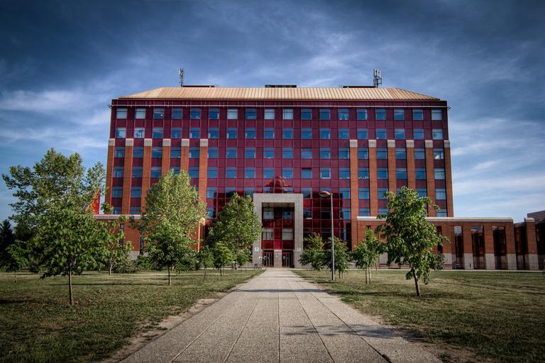 Keywords: infopark budapest building red courtyard pathway sky clouds hungary
