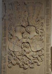 Keywords: Ingelheim Burgkirche Grabstein Lisa Wolf von Sponheim.jpg Ingelheim am Rhein Burgkirche Grabstein Epitaph der Lisa Wolf von Sponheim Elisabeth Wolfin von Sponheim 1503 Ehefrau des Hans von Ingelheim 1480 ; siehe http //www ingelheimer-geschichte de/index php id 424 dort ein c zuwenig in der Transkription des Todesjahrs richtig m ccccc iii ; optisch links Wappen Ingelheim rechts Wappen Sponheim; laut dem Siebmacher File Sponheim-Wappen Sm png entspricht das Wappen der Linie Stockheim own own photograph 2015-04-30 Photo Andreas Praefcke <gallery>Grabmal4 JPG</gallery> Photos by User AndreasPraefcke Wall mounted church monuments in Burgkirche Ingelheim Reliefs of coats of arms in Landkreis Mainz-Bingen 1503 sculptures Coats of arms of Ingelheim family Coats of arms of Sponheim family |