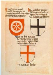 Keywords: Ingeram Codex 037.jpg Ingeram-Codex der ehemaligen Bibliothek Cotta <br/> Xviij <br/> Menß gefriet an der zal/ <br/> an dem so stat des riches wal/<br/>kains fürsten recht sta i t bas zehand/<br/> canzly regiert all deusche land <br/> <br/>Köln des stifftes wirdikeit/<br/> sol sin des riches kür bereit/ <br/> regieren die canzly gelich/ <br> wa n ein keyser zug in fran k rich/ <br/> <br/> Trier der eldste anevanck/ <br/> des riches kur da mit zu danck/ <<br/> lamparten des rychs wirdikeit <br/> canzly eim keyser sin bereitt/ <br/> <br/> das machet alde stettikeit Die Wappenbücher Herzog Albrechts VI von Österreich Ingeram-Codex d ehem Bibliothek Cotta; hrsg v Charlotte Becher u Ortwin Gamber; Wien; Köln; Graz; 1986 Jahrbuch der Heraldisch-Genealogischen Gesellschaft Adler; Folge 3 Bd 12 Jg 1984/85; ISBN 3-205-05002-9 1459 Hans Ingeram and a so called Exempla-master Reproduction of a painting that is in the public domain because of its age PD-old-100 Exempla Meister-Reichsverfassung Cologne See coats of arms Mainz See coat of arms Trier See coat of arms |