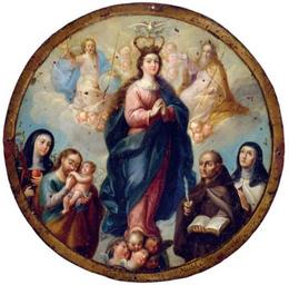 Keywords: Inmaculada Concepción acompañada por los santos Gertrudis, José con el Niño, Juan de Dios y Teresa de Jesús, bajo la protección de la Santísima Trinidad Escudo de monja.tif accession number es Inmaculada Concepción acompañada por los santos Gertrudis José con el Niño Juan de Dios y Teresa de Jesús bajo la protección de la Santísima Trinidad en Immaculate Conception Surrounded by Saints Gertrude Joseph with Child John of God and teresa de Avila Under The Protection of the Holity Trinity Width cm 19 exhibition history Institution Museo Soumaya Plaza Carso oil copper object history object type PD-US PD-old-100 place of creation PD-Art Escudo de monja 1750 paintings in Mexico 18th-century paintings from Mexico Nun's shields of the Museo Soumaya collection |