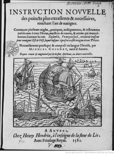 Keywords: Instruction nouvelle.jpeg fr Instruction nouvelle des poincts plus excellents et nécessaires touchant l'art de naviguer nouvellement practiqué et composé en langue thioise par Michiel Coignet Depuis reveu et augmenté par le mesme autheur 1581 http //gallica bnf fr/ark /12148/bpt6k64364237 Michiel Coignet Published by H Hendrix Antwerp ; French language; Format In-4° 98 p fig; Source Bibliothèque nationale de France département Réserve des livres rares V-9582 other versions PD-old-100 Michiel Coignet Frontispieces from Flanders 1581 books Books published in Antwerp |