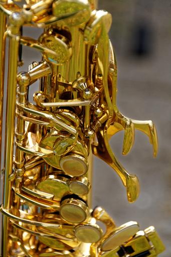 Keywords: instrument musical instrument wind instrument brass instrument saxophone saxophone detail close up analog band music close