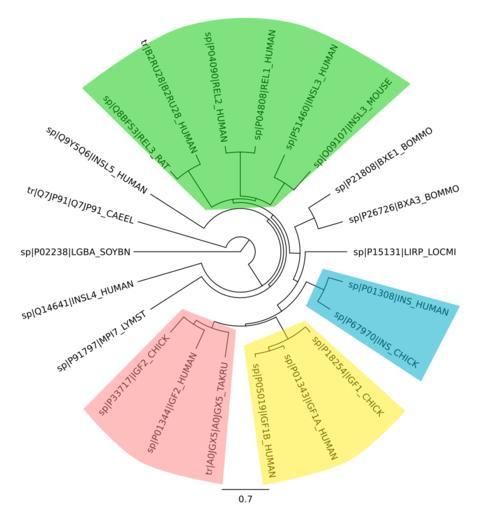 Keywords: Insulin-like peptides phytree.svg en Phylogenetic tree of insulin-like peptides Homology groups are colored green Relaxin 1-3 insulin-like 3 blue insulin yellow IGF1A/B red IGF2 own Ayacop 2009-12-20 Insulin-like Phylogenetic trees