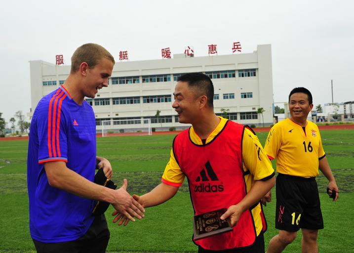Keywords: Inter-navy sports games in China 150421-N-NM917-158.jpg en 150421-N-NM917-158 ZHANJIANG People's Republic of China - Cryptologic Technician Technical 2nd Class Christopher Duggas attached to the U S 7th Fleet Flagship USS Blue Ridge shakes hands with a People's Liberation Army Navy sailor following an inter-navy soccer game Blue Ridge is conducting a port visit to Zhanjiang to build naval partnerships with China's South Sea Fleet to ensure peace and prosperity for the entire region 2015-04-21 April 21 2015 https //www dvidshub net/image/1886599 150421-N-NM917-158 2015-04-21 06 28 ZHANJIANG CN PD-USGov-Military-Navy USS Blue Ridge LCC-19 Images from DoD uploaded by Fæ |