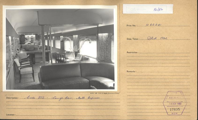 Keywords: archives state records nsw staterecordsnsw newsouthwales blackandwhite rail railway indoor black and white Title: Interior of railway carriage showing lounge car on the 'Melbourne Express' Dated: February 1962 Digital ID: 17420_a014_a014000882 Series: NRS 17420 State Rail Authority Archives Photographic Reference Print Collection Rights: No known copyright restrictions www.records.nsw.gov.au/about-us/rights-and-permissions We'd love to hear from you if you use our photos/documents. Many other photos in our collection are available to view and browse on our website using Photo Investigator. Title: Interior of railway carriage showing lounge car on the 'Melbourne Express' Dated: February 1962 Digital ID: 17420_a014_a014000882 Series: NRS 17420 State Rail Authority Archives Photographic Reference Print Collection Rights: No known copyright restrictions www.records.nsw.gov.au/about-us/rights-and-permissions We'd love to hear from you if you use our photos/documents. Many other photos in our collection are available to view and browse on our website using Photo Investigator. |