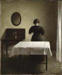 Keywords: Interior (Vilhelm Hammershøi) - Nationalmuseum - 21409.tif Artwork Creator Vilhelm Hammershøi Interior A solitary woman in a sparsely furnished room is a recurring theme in Hammershøi ™s pictures The light comes from the side and the figure often has her back to the viewer Clear models for these interiors can be found in 17th-century Holland or early 19th- century Denmark But Hammershøi ™s silent empty rooms also have an intense suggestive mood all their own Most of his interior scenes were painted in his home in Copenhagen but this one was executed in London The model is the artist ™s wife Ida En ensam kvinna i ett sparsamt möblerat rum är ett Ã¥terkommande tema i Hammershøis bilder Ljuset faller in frÃ¥n sidan och ofta vänder modellen ryggen mot betraktaren Hans interiörer har tydliga förebilder i det holländska 1600-talet eller i det tidiga danska 1800-talet Men Ham mershøis tysta och tomma rum har ocksÃ¥ en alldeles egen förtätad och suggestiv stämning De flesta av hans interiörbilder tillkom i hemmet i Köpenhamn Denna mÃ¥lning är dock utförd i London Modellen är konstnärens hustru Ida header A solitary woman in a sparsely furnished room is a recurring theme in Hammershøi ™s pictures The light comes from the side and the figure often has her back to the viewer Clear models for these interiors can be found in 17th-century Holland or early 19th- century Denmark But Hammershøi ™s silent empty rooms also have an intense suggestive mood all their own Most of his interior scenes were painted in his home in Copenhagen but this one was executed in London The model is the artist ™s wife Ida En ensam kvinna i ett sparsamt möblerat rum är ett Ã¥terkommande tema i Hammershøis bilder Ljuset faller in frÃ¥n sidan och ofta vänder modellen ryggen mot betraktaren Hans interiörer har tydliga förebilder i det holländska 1600-talet eller i det tidiga danska 1800-talet Men Ham mershøis tysta och tomma rum har ocksÃ¥ en alldeles egen förtätad och suggestiv stämning De flesta av hans interiörbilder tillkom i hemmet i Köpenhamn Denna mÃ¥lning är dock utförd i London Modellen är konstnärens hustru Ida 1898 Oil on canvas Olja pÃ¥ duk Size cm 46 51 5 Framed Size cm 66 77 6 Institution Nationalmuseum Stockholm Signerad Hammershøi 1898 accession number 21409 NM 4357 place of creation Nationalmuseum Nationalmuseum Stockholm cooperation project Licensed-PD-Art PD-old-auto PD-Nationalmuseum_Stockholm 1916 Media contributed by Nationalmuseum Stockholm 2016-10 Paintings by Vilhelm Hammershøi in the Nationalmuseum Stockholm 1898 paintings |