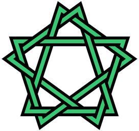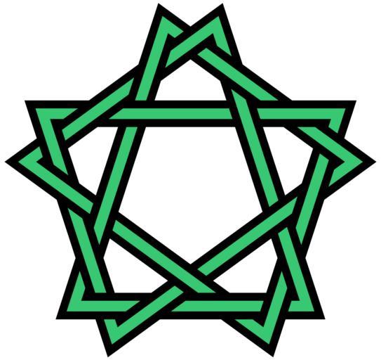 Keywords: Interlaced ten-point star in irregular decagon.svg Interlaced ten-point star in irregular decagon Five-fold version of File Knotwork-cross- simplest -or-eightfold-star- irregular svg For a seven-fold version see File Interlaced 14-point star in irregular polygon svg Topologically this is a knot with 20 crossings Generated from a version of the following PostScript vector source code <pre> 300 396 translate 1 91 dup scale -18 rotate /A dup cos 100 mul exch sin 100 mul def/X 9 226 def 90 X add A moveto 198 X sub A lineto 306 X add A lineto 54 X sub A lineto 162 X add A lineto 270 X sub A lineto 18 X add A lineto 126 X sub A lineto 234 X add A lineto 342 X sub A lineto closepath gsave 16 0329119 setlinewidth stroke grestore 4 8 6 setrgbcolor 6 41316478 setlinewidth stroke showpage EOF</pre> 2011 AnonMoos <gallery>File Knotwork-cross- simplest -or-eightfold-star- irregular svg File Interlaced 14-point star in irregular polygon svg</gallery> Ten pointed stars SVG stars 5-fold rotational symmetry Knots knot theory Images with PostScript source code Knots and links on transparent background 20 crossing number knots and links Outline knots and links |