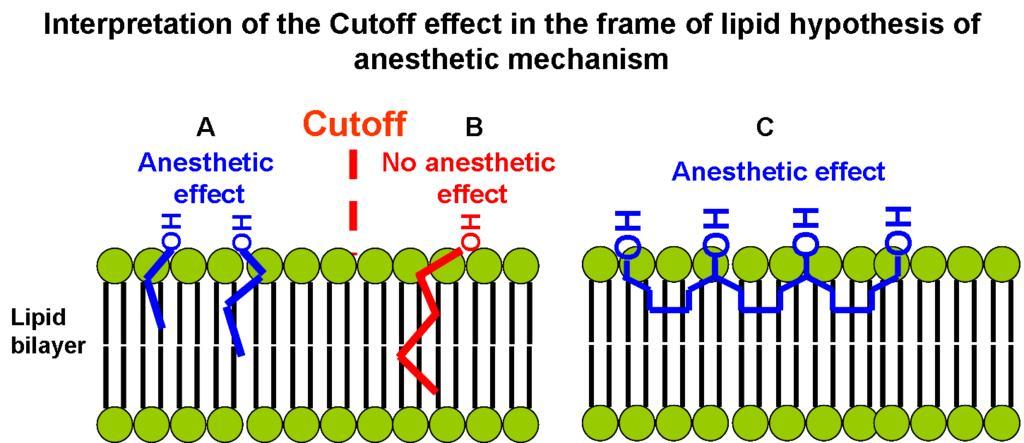 Keywords: Interpretation of the cutoff effect in the frame of lipid hypothesis of anesthetic mechanism.png en A Short hydrocarbon chains are relatively rigid in terms of conformational enthropy and are close to alkanol hydroxyl group buoy tethered to the interface This makes short chain alkanols efficient mediators that redistribute lateral stress from membrane interior to its interface B This ability decreases in the row of n-alkanols since longer chains are more flexible and are not so tightly tethered to the hydroxyl group C Polyhydroxyalkanes 1 6 11 16-hexadecanetetraol and 2 7 12 17-octadecanetetraol exhibit significant anesthetic potency as was predicted by cutoff effect because the length of the hydrocarbon chain between hydroxyl groups is smaller than the cutoff Own Akuznetsova 2009-04-19 public domain This picture was made based on information obtained from J Med Chem 2005 48 12 pp 4172 “4176 Unidentified biology diagrams |