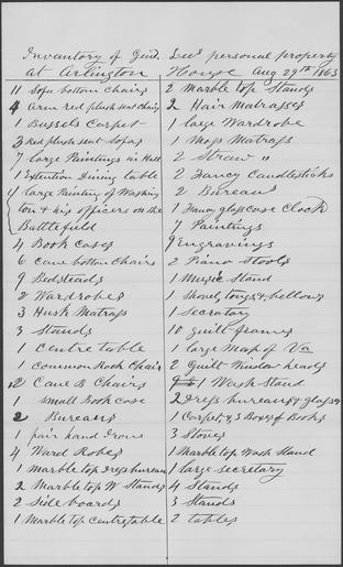 Keywords: Inventory of General Robert E. Lee's Personal Property at Arlington House - NARA - 279088.tif Scope and content This inventory enumerates furniture household accessories prints and paintings including 1 large painting of Washington and his officers on the battlefield at Arlington House at the time of its confiscation during the case of U S v All the Rights Titles of Robert E Lee General notes 279088 Local identifier U S District Court for the Eastern District of Virginia Alexandria Term 06/11/1864 - ca 1866 NARA-Place Arlington Virginia United States North and Central America county 4204816 38 867 -77 1 <br /> NARA's Mid Atlantic Region Philadelphia NRBA 900 Market Street Philadelphia PA 19107-4292 1863-08-29 Record group Record Group 21 Records of District Courts of the United States 1685 - 2004 Record group ARC 350 Confiscation Case Files compiled 1863 - 1865 Series ARC 279086 File unit U S v The Right Title Interest and Estate of Robert E Lee 08/29/1863 - 06/24/1864 File unit ARC 279087 Variant control numbers NAIL Control Number NRBPA-21-51E147-236-1<br /> Other Finding Aid Identifier 85<br /> The Robert E Lee Confiscation Case was originally docketed as case number 85 Prior to transfer to the National Archives the cases were rearranged alphabetically and the Robert E Lee Case renumbered as number 236 The original order has been restored and it is again filed as number 85 Researchers may see annotations for both numbers on various documents <br /> Other Identifier 06296<br /> This is the NARA Internal Exhibit Tracking Number for the Public Vaults exhibit <br /> Search Identifier siLearning Center<br /> Search Identifier siNational History Standard Era 5 yes Other versions <gallery> File Inventory_of_General_Robert_E _Lee's_Personal_Property_at_Arlington_House_-_NARA_-_279088 tif tif File Inventory_of_General_Robert_E _Lee's_Personal_Property_at_Arlington_House_-_NARA_-_279088 jpg jpg </gallery> NARA-cooperation PD-USGov Manuscripts Bills and receipts Robert E Lee National Memorial Robert Edward Lee 1863 documents NARA TIF images with categorized JPGs |