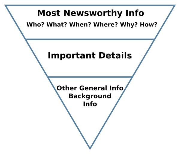 Keywords: Inverted pyramid 2.svg The Inverted pyramid technique of journalism writing Inverted_pyramid jpg 2011-01-24 09 15 UTC Inverted_pyramid jpg The Air Force Departmental Publishing Office AFDPO derivative work Makeemlighter Vector text versions Inverted pyramid svg Redrawn as SVG with text as paths Makeemlighter Inverted_pyramid jpg Original upload log This image is a derivative work of the following images File Inverted_pyramid jpg licensed with PD-USGov-Military-Air Force 2011-01-23T21 26 05Z P S Burton 718x569 31907 Bytes <nowiki> http //www shaw af mil/library/editorialpolicy submissions/newsarticles asp US Air Force Shawn Air Force Base 20th FW Editorial Policy Submission Guidelines Not given T</nowiki> Uploaded with derivativeFX Journalism |