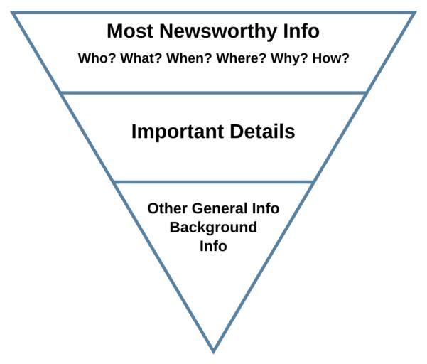 Keywords: Inverted pyramid.svg The Inverted pyramid technique of journalism writing Inverted_pyramid jpg 2011-01-24 09 00 UTC Inverted_pyramid jpg The Air Force Departmental Publishing Office AFDPO derivative work Makeemlighter Vector text versions Inverted pyramid 2 svg ; Translations Arabic Korean Redrawn as SVG Makeemlighter Inverted_pyramid jpg Original upload log This image is a derivative work of the following images File Inverted_pyramid jpg licensed with PD-USGov-Military-Air Force 2011-01-23T21 26 05Z P S Burton 718x569 31907 Bytes <nowiki> http //www shaw af mil/library/editorialpolicy submissions/newsarticles asp US Air Force Shawn Air Force Base 20th FW Editorial Policy Submission Guidelines Not given T</nowiki> Uploaded with derivativeFX Journalism |